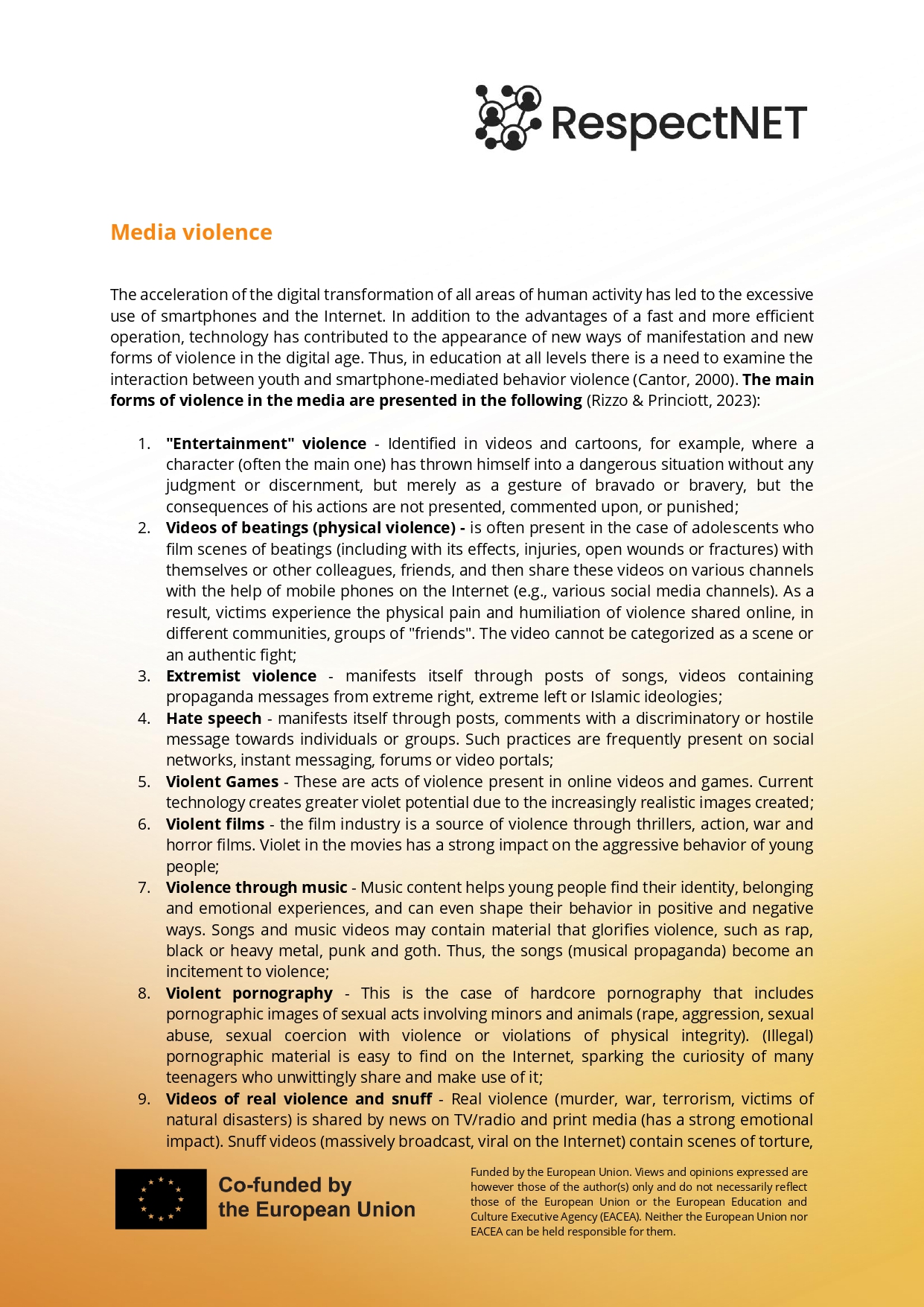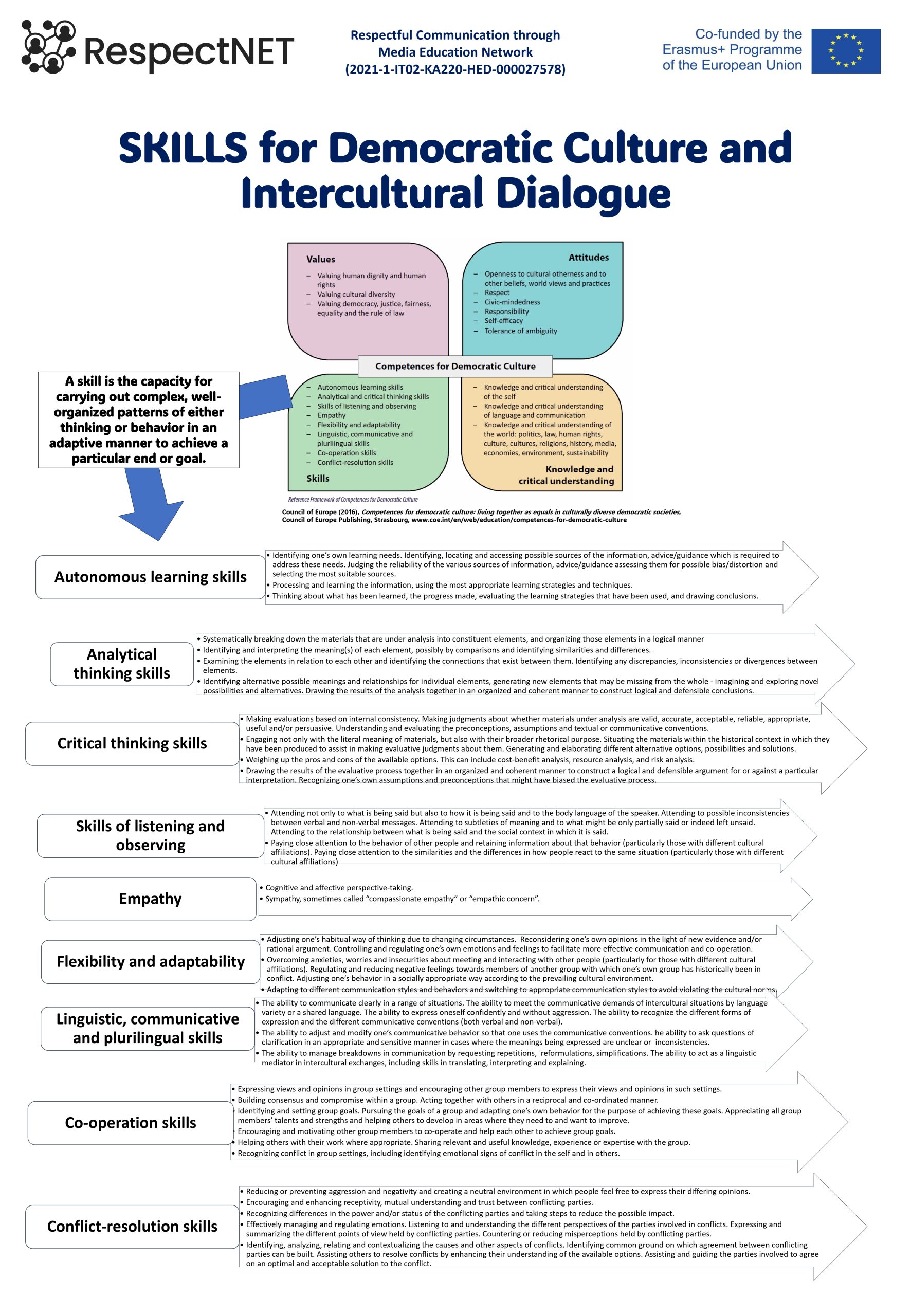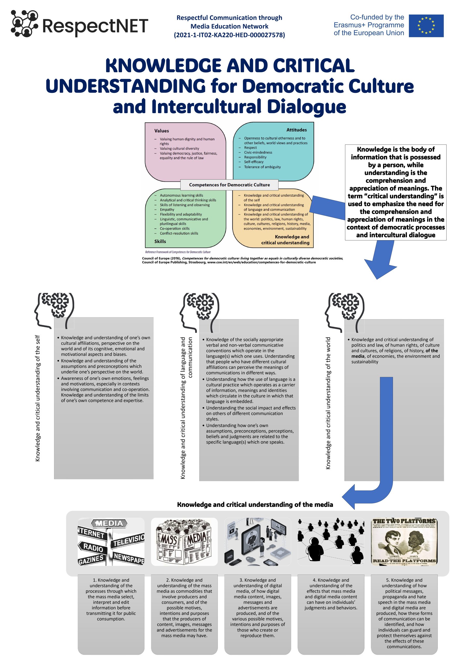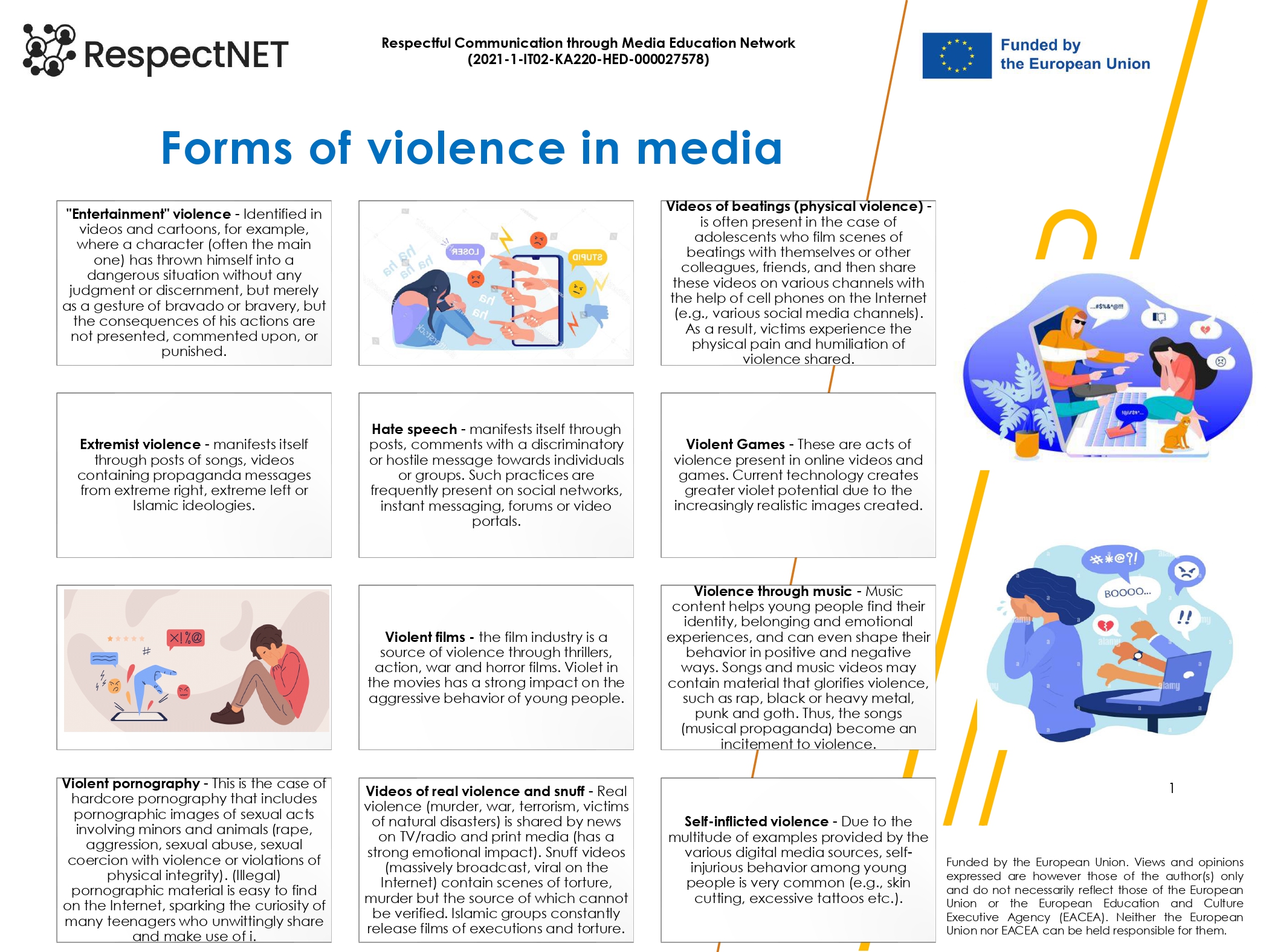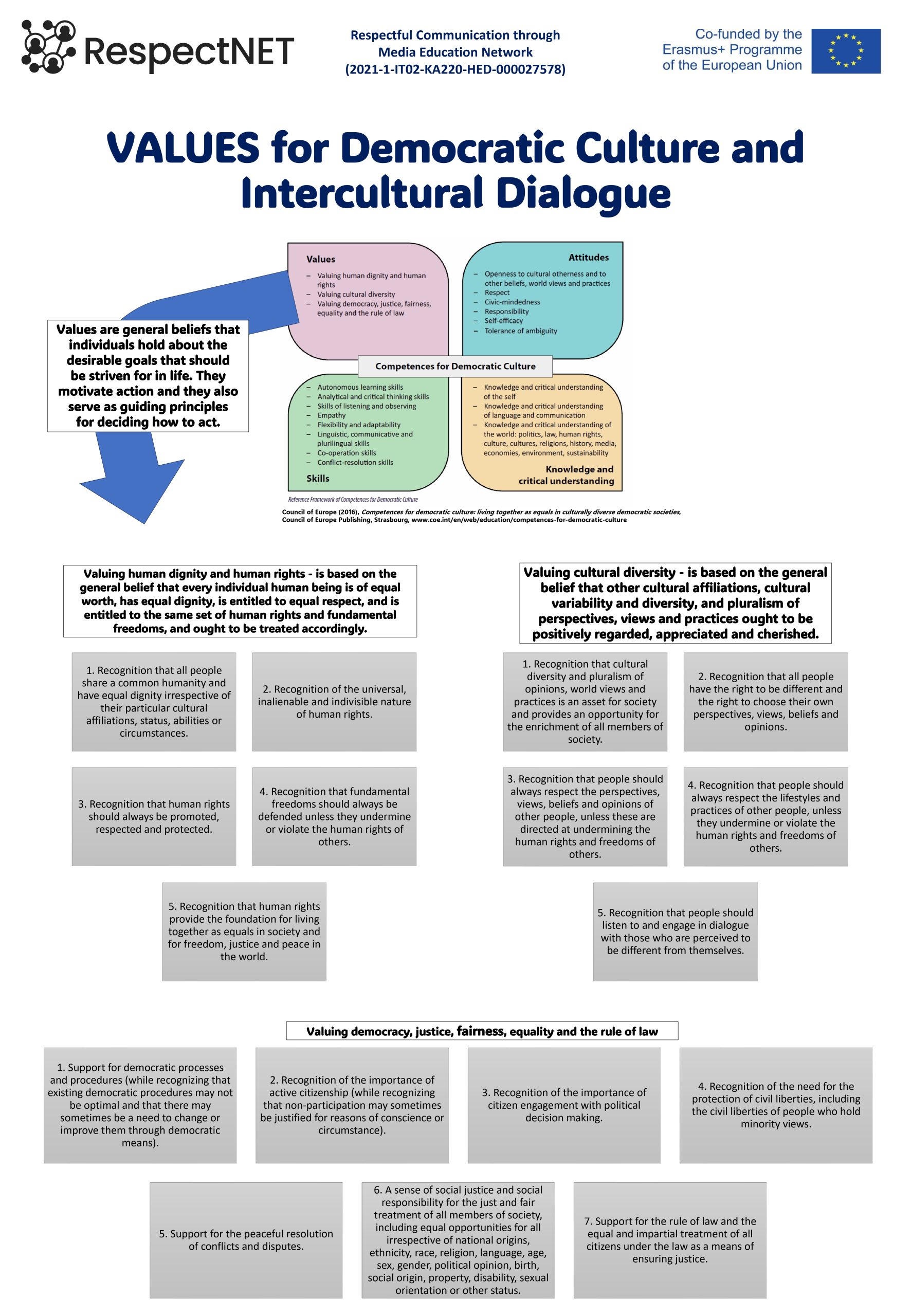 The below presented UPT-produced materials encompass a series of informative posters and infographics. The first addresses various forms of media violence, exploring their societal impact. The subsequent three focus on fostering a democratic culture and intercultural dialogue, covering values, skills, and attitudes essential for such environments. The final piece delves into the knowledge and critical understanding necessary to contribute to a democratic culture and engage in meaningful intercultural dialogue. Each resource serves as a visual guide, offering insights into different aspects crucial for building a harmonious and inclusive community at UPT.